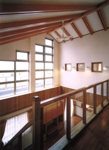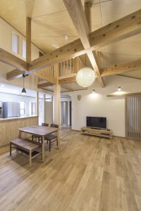 旧家の建材と新しい無垢の梁が複雑に交差する吹き抜けです。