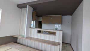 キッチンの天井は色を変えて濃いブラウンになっています。