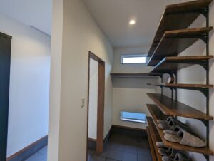 レンガ調のクロスや黒を基調としたキッチンがかっこいいLDKです。