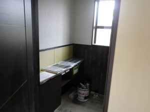 壁板を壁板を張り終わってから洗面化粧台を搬入します。